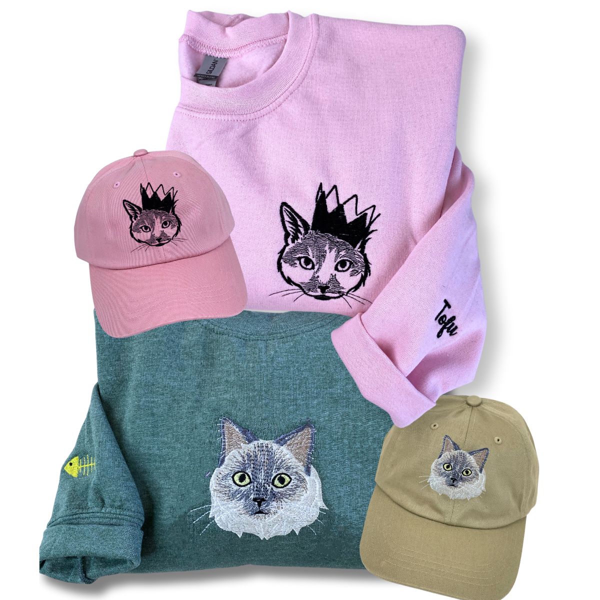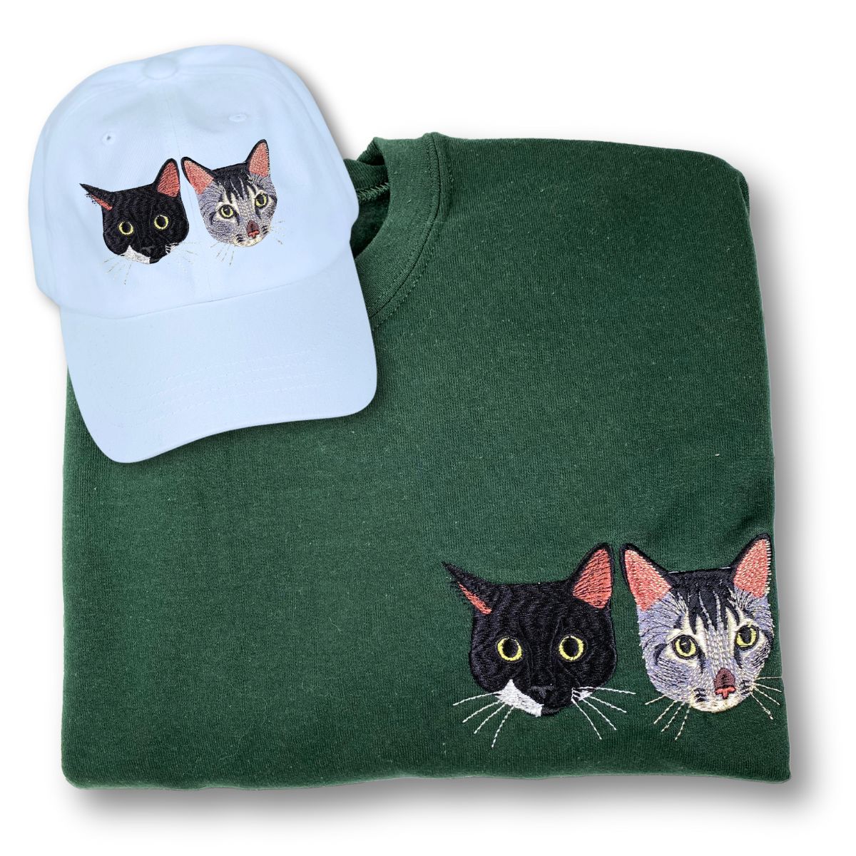 Show your feline love with our Cat Print Embroidered Sweatshirt & Matching Hat Bundle Set. Stay warm and stylish with the cozy sweatshirt featuring a custom cat portrait embroidery. The adjustable hat completes the look with a matching embroidered design. Made from premium materials for ultimate comfort this twin pack offers a purr fect way to display your kittys charm. Get yours now and carry your beloved cat with you everywhere you go.