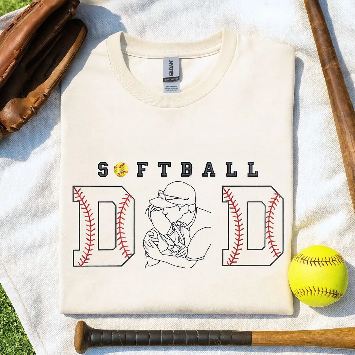 Celebrate the bond between a father and his softball loving kid with this custom embroidered softball dad shirt. Featuring a stitched portrait photo on the front and your childs name elegantly embroidered on the sleeve this shirt is a memory woven into fabric. Ideal for Fathers Day birthdays or game day surprises its designed to make dads feel seen loved and proud. Crafted with heartfelt durable custom embroidery. Add a personal touch today.