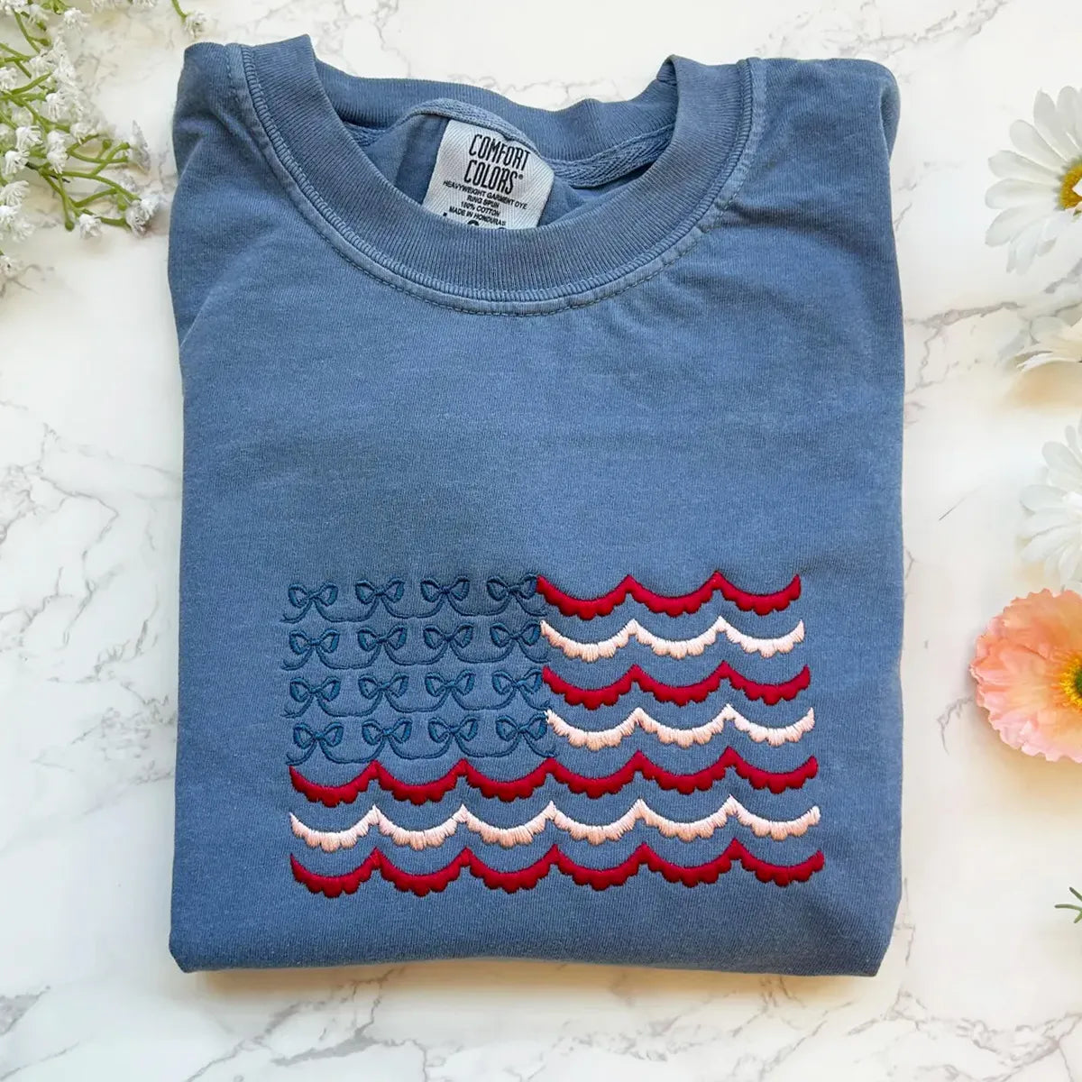 Celebrate the 4th of July in style with our Embroidered American Flag Sweatshirt. Replace traditional stars with playful bow patterns that add a fun feminine twist to patriotic wear. Crafted on premium Gildan fabric for comfort durability and detailed embroidery that wont fade making it ideal for BBQs parades and group celebrations. Make this 4th memorable with compliments guaranteed all day long.