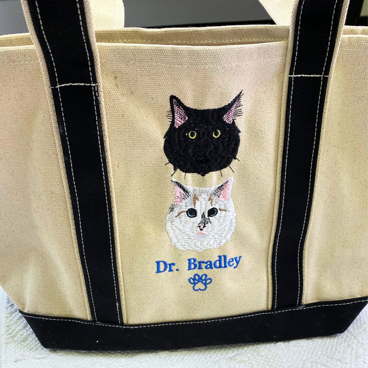 Elevate your outfit with our Embroidered Cat Design Tote Bag. Match your love for cats with this stylish high quality tote featuring the charming cat design from your sweatshirt. Carry your essentials in versatile style wherever you go — work shopping or daily outings. The spacious interior sturdy handles and eye catching embroidery make this bag both practical and personalized. Enhance your wardrobe with this adorable tote bag today.