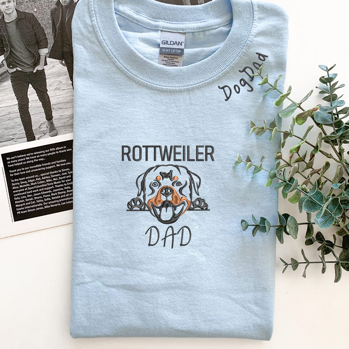 Celebrate your love for Rottweilers with our personalized Rottweiler Dog Dad Shirt. Expertly embroidered and crafted to showcase your bond with your beloved pet. This comfortable shirt is a unique and heartfelt gift for any Rottweiler loving dad. Made from high quality materials our shirt is a tribute to the special connection between man and dog. Order yours today and proudly embrace the joy of being a Rottweiler dad.