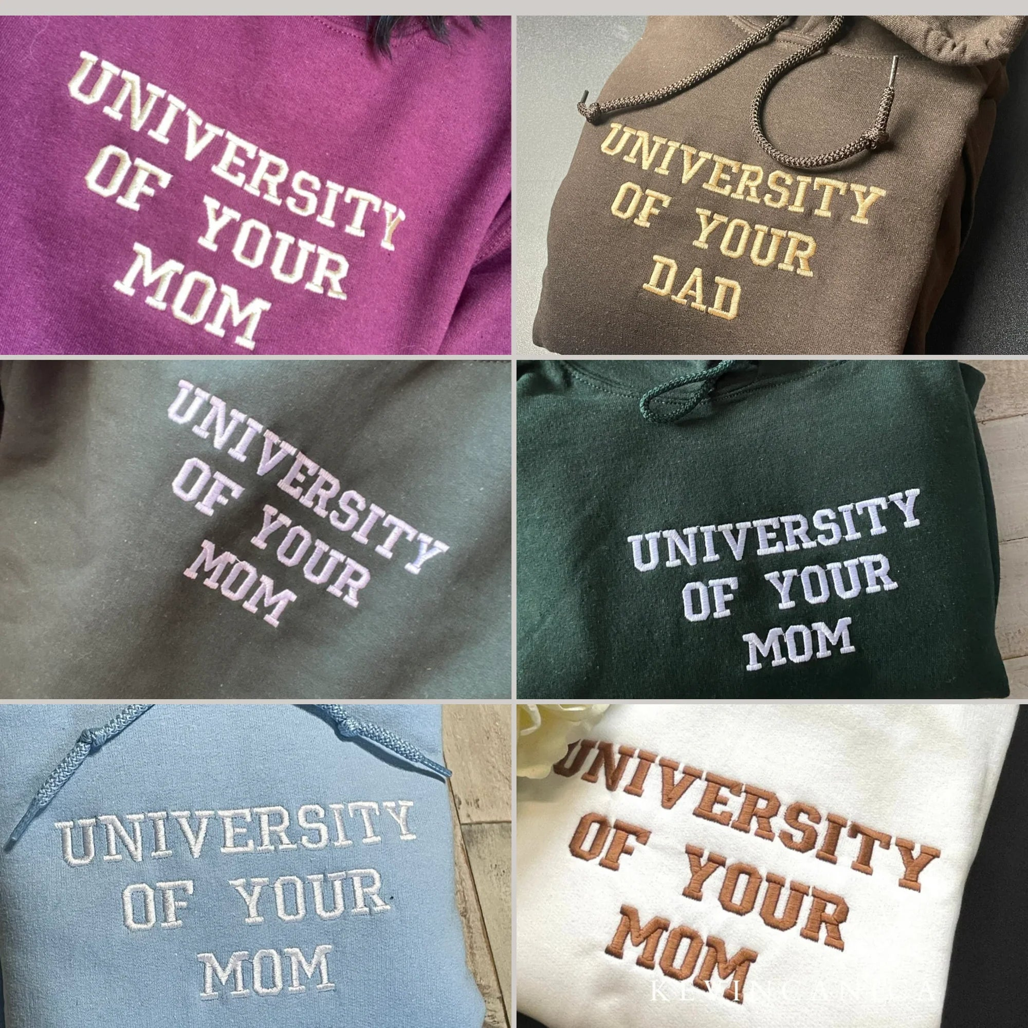 Indulge in the soft comfort of ourUniversity of Your Momembroidered sweatshirt hoodie perfect for daily wear made from premium materials. Show Mom your love with personalized kidsnames and icons. This stylish yet cozy sweatshirt is versatile for various activities like coffee runs shopping and casual outings. Crafted for comfort and style the high quality embroidery ensures long lasting vibrancy. Celebrate humor and playfulness with this unique thoughtful gift. Order now and elevate your casual wardrobe.