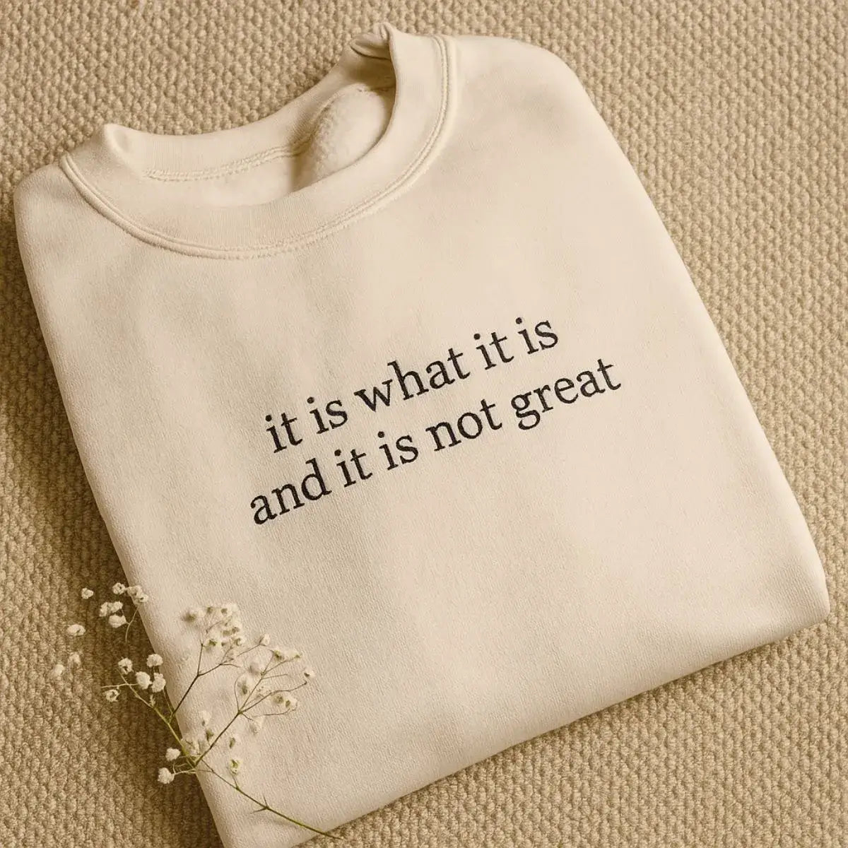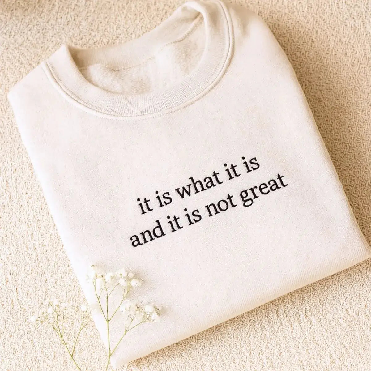 Express your mood with this embroideredIt Is What It Is – And Its Not Greattee. Made with soft and breathable cotton for a premium feel. The minimalist design and unisex fit offer versatility in styling. Perfect for those seeking fashion with irony and existential vibes. Let your outfit match your unique vibe effortlessly.