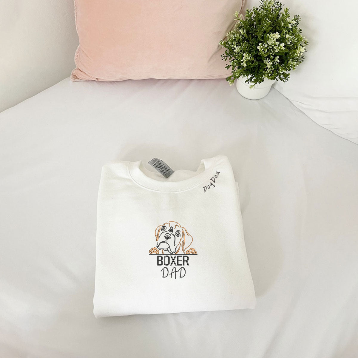 Customize your style with our Boxer dog dad sweatshirt featuring high quality personalized embroidery. Choose from various fonts and thread colors to match your taste. This sweatshirt celebrates the special bond with your furry friend and offers easy maintenance with durable fabric that retains its shape and color wash after wash. Stay fresh and stylish effortlessly.