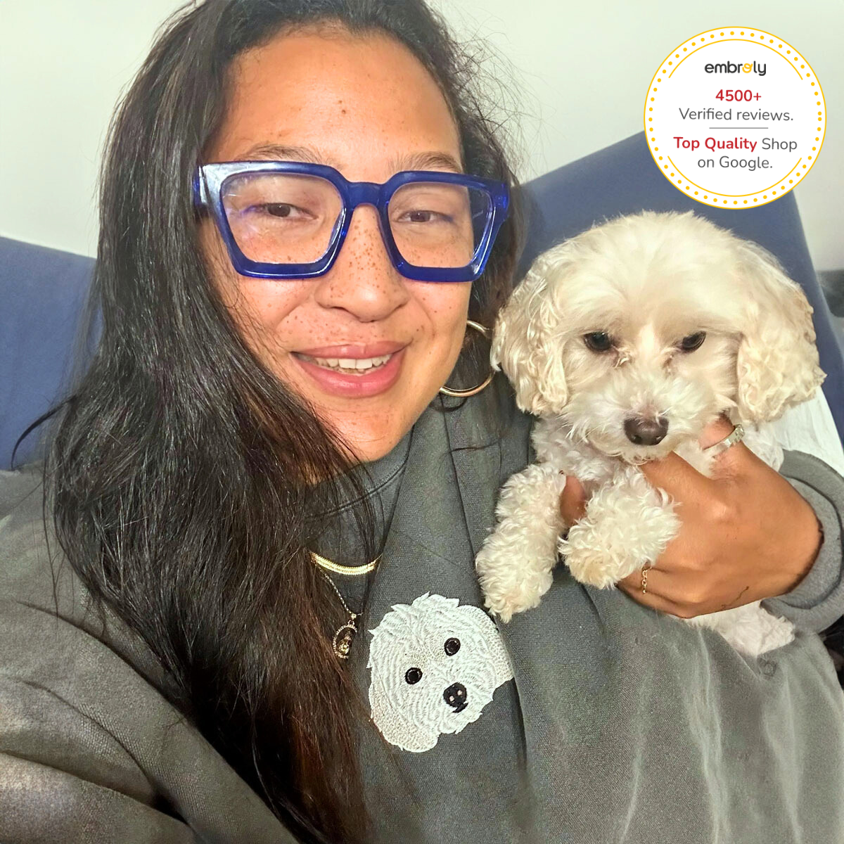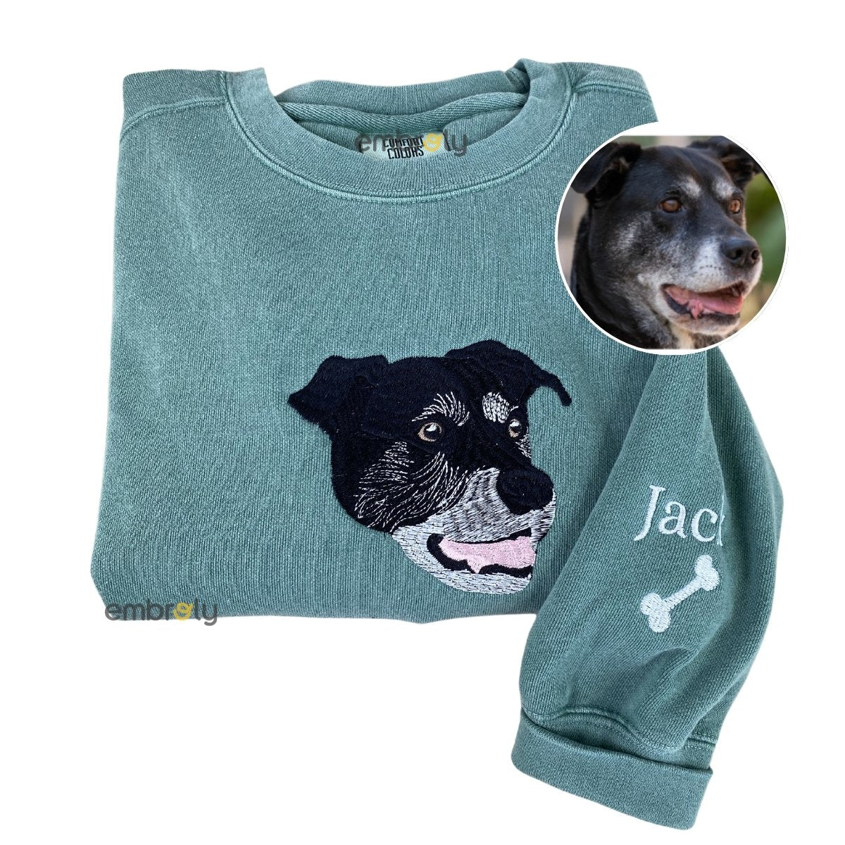 Indulge in the charm of the Embroidered Dog Face Sweatshirt showcasing intricate canine detailing and customizable with a unique dog name. Perfect for casual outings dog walking or relaxing at home. Discover various colors on Embroly.com to craft a memorable gift ideal for pet admirers.