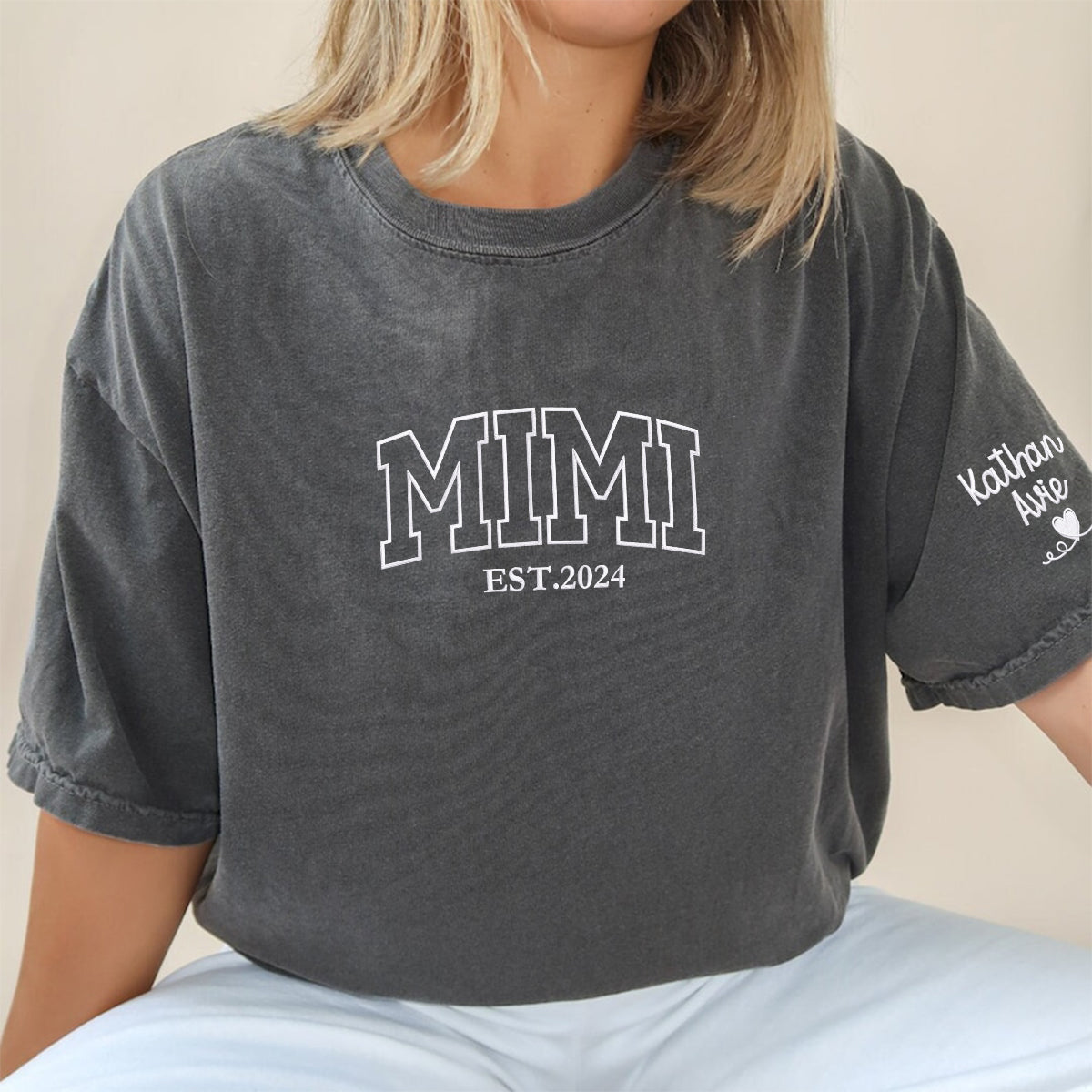 Celebrate and honor Mimi with a personalized shirt featuring her grandkidsnames elegantly embroidered. This Comfort Color® shirt offers unmatched softness and durability ensuring both comfort and style. Show your love for Mimi on special occasions with this heartfelt tribute that shell cherish every time she wears it. Find the perfect gift to warm her heart.