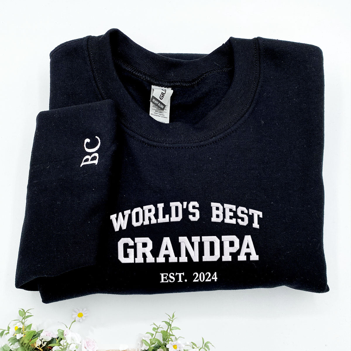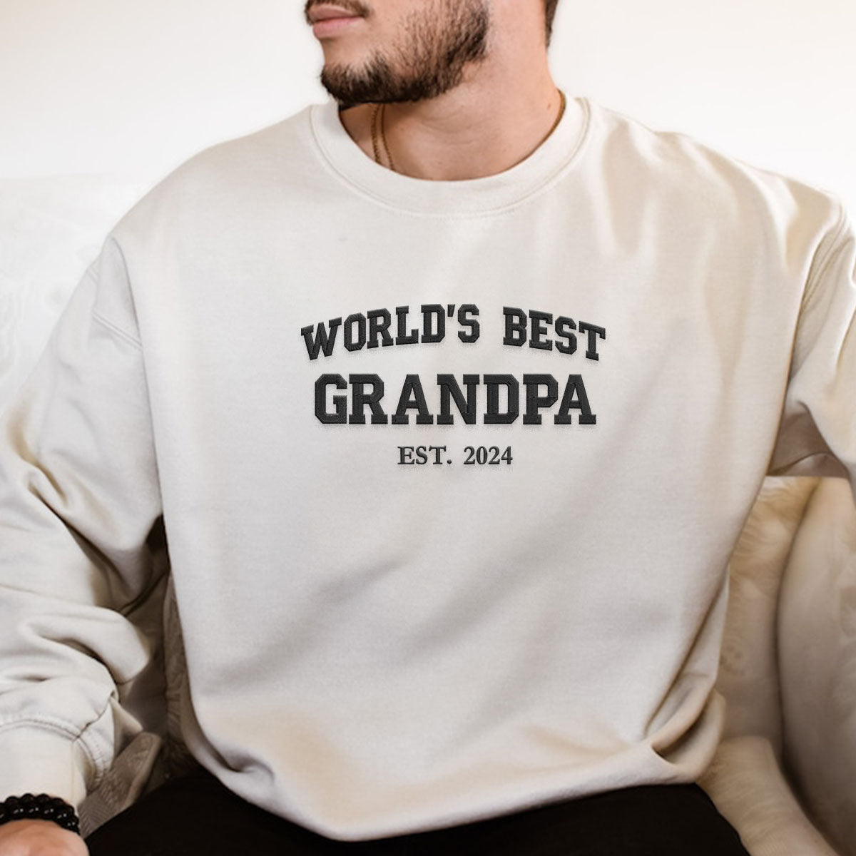 Celebrate Grandpa with our personalized sweatshirt featuring embroidered text ofWorlds Best Grandpaand GrandKids Names on the sleeve. Not only does it make a bold statement but also shows how amazing he is. This sweatshirt is a perfect gift for birthdays holidays or simply to show your love. Crafted for comfort its made with high quality soft fabric that is gentle on the skin and provides warmth during cool evenings. The durable construction and sturdy embroidery ensure this sweatshirt lasts making it a cherished keepsake for Grandpa. Spoil Grandpa today and treat him to this cozy sweatshirt.