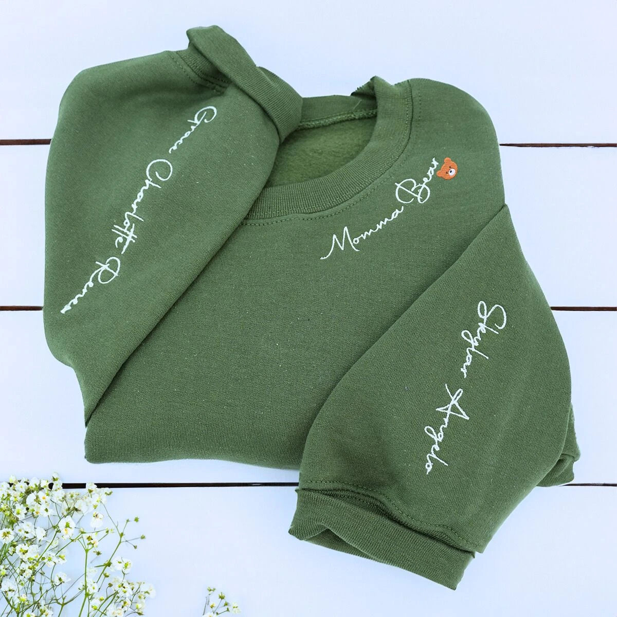 Discover the perfect personalizedMamaEmbroidered Sweatshirt featuring your childrens names on the sleeve. Warm her heart with this keepsake ideal for birthdays Mothers Day or any occasion. Customize with up to 8 names in various thread colors and font styles to create a unique stylish gift that celebrates the bond between mother and child. See why moms adore this thoughtful present.